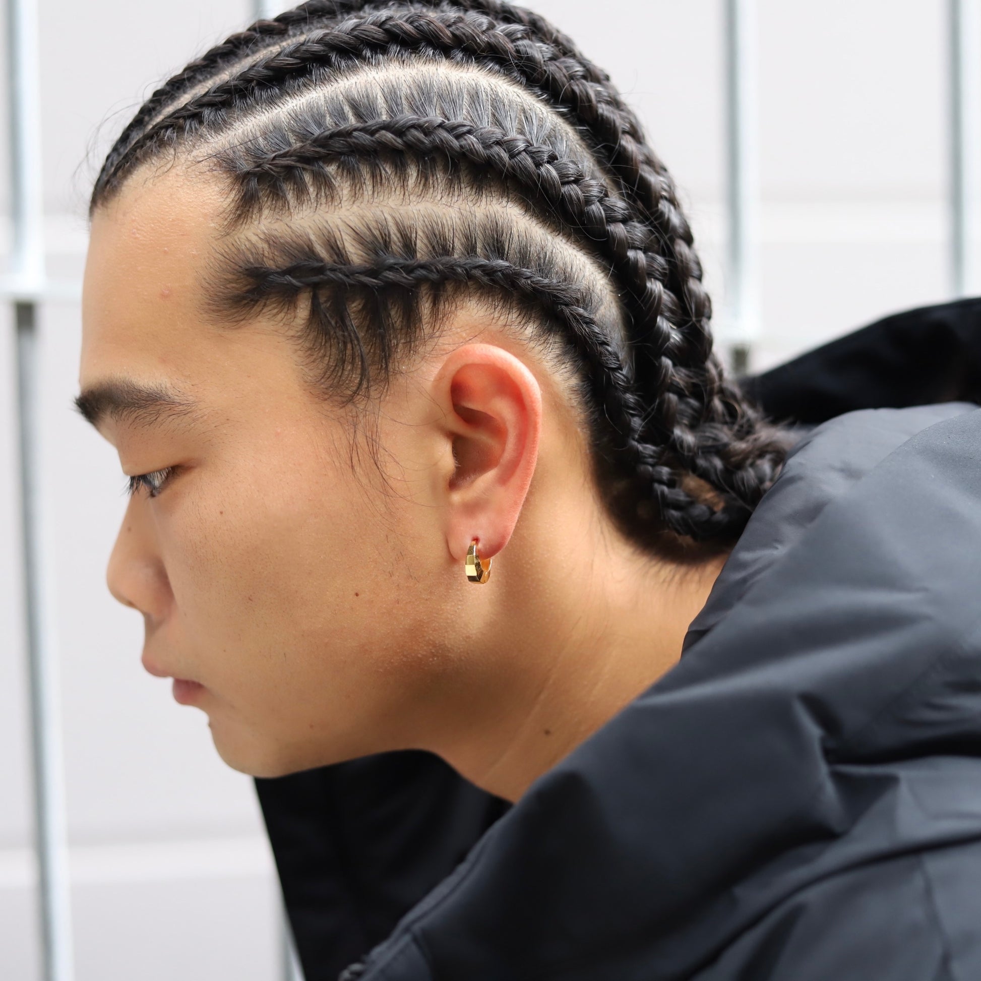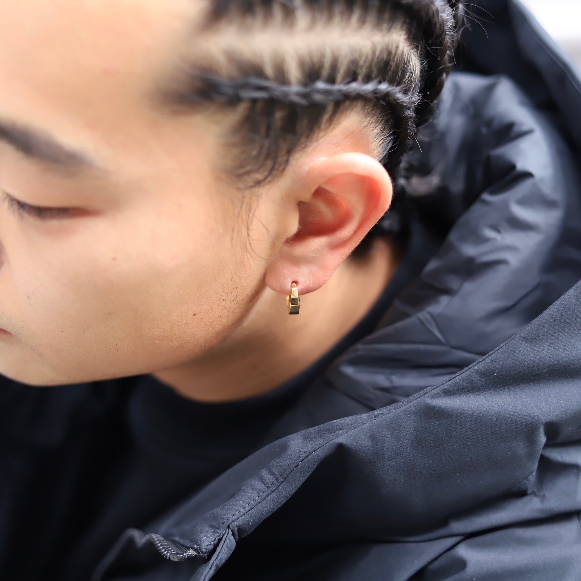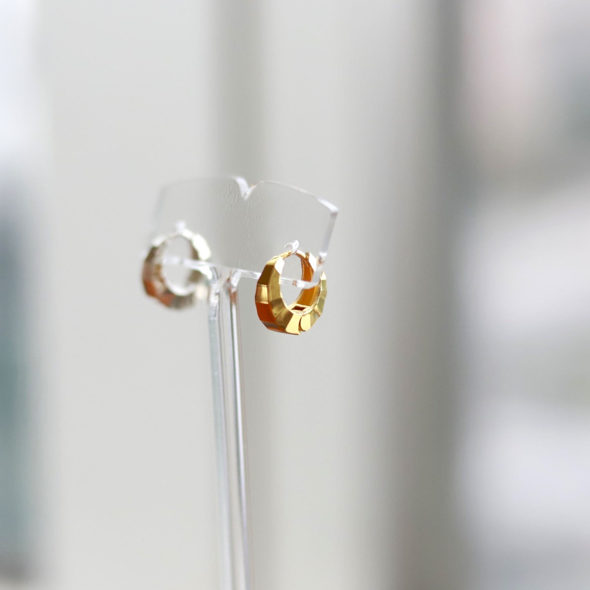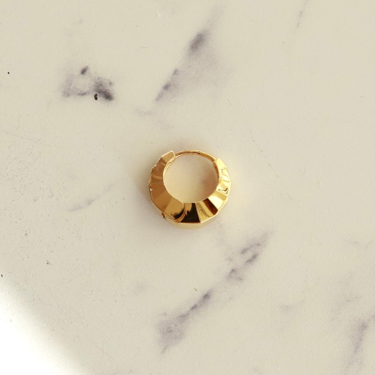 ■ 三日月のようなフープピアス。小ぶりですが立体感があり顔まわりをモードな印象にしてくれます。