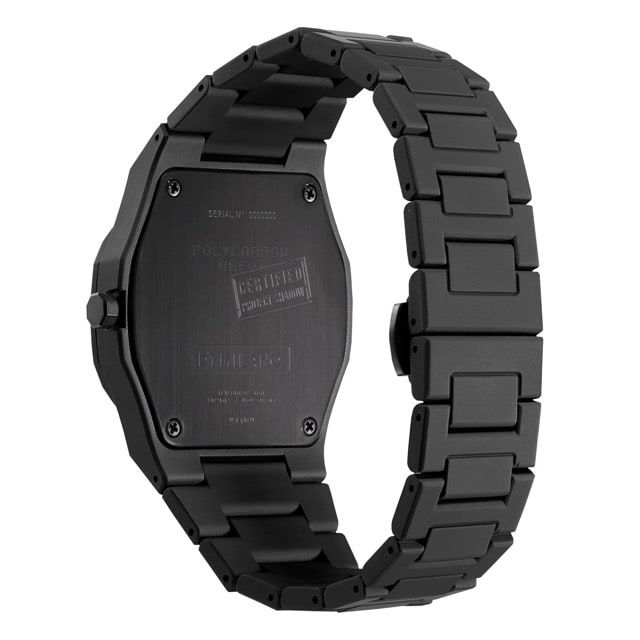 ■ ブレスレットにポリカーボンネイトを用いたモデル。ケースの厚みは僅か9㎜と極薄で、かつ54gという超軽量を実現。表面はゴムのような柔らかい感触のソフトタッチコーティングを施し、オールブラックながら針と文字盤外周にBlack Luminova(蓄光塗料)が使用されており、夜間の視認性も確保されている。さらに5気圧防水を備え、日常使いに不便を感じさせない。