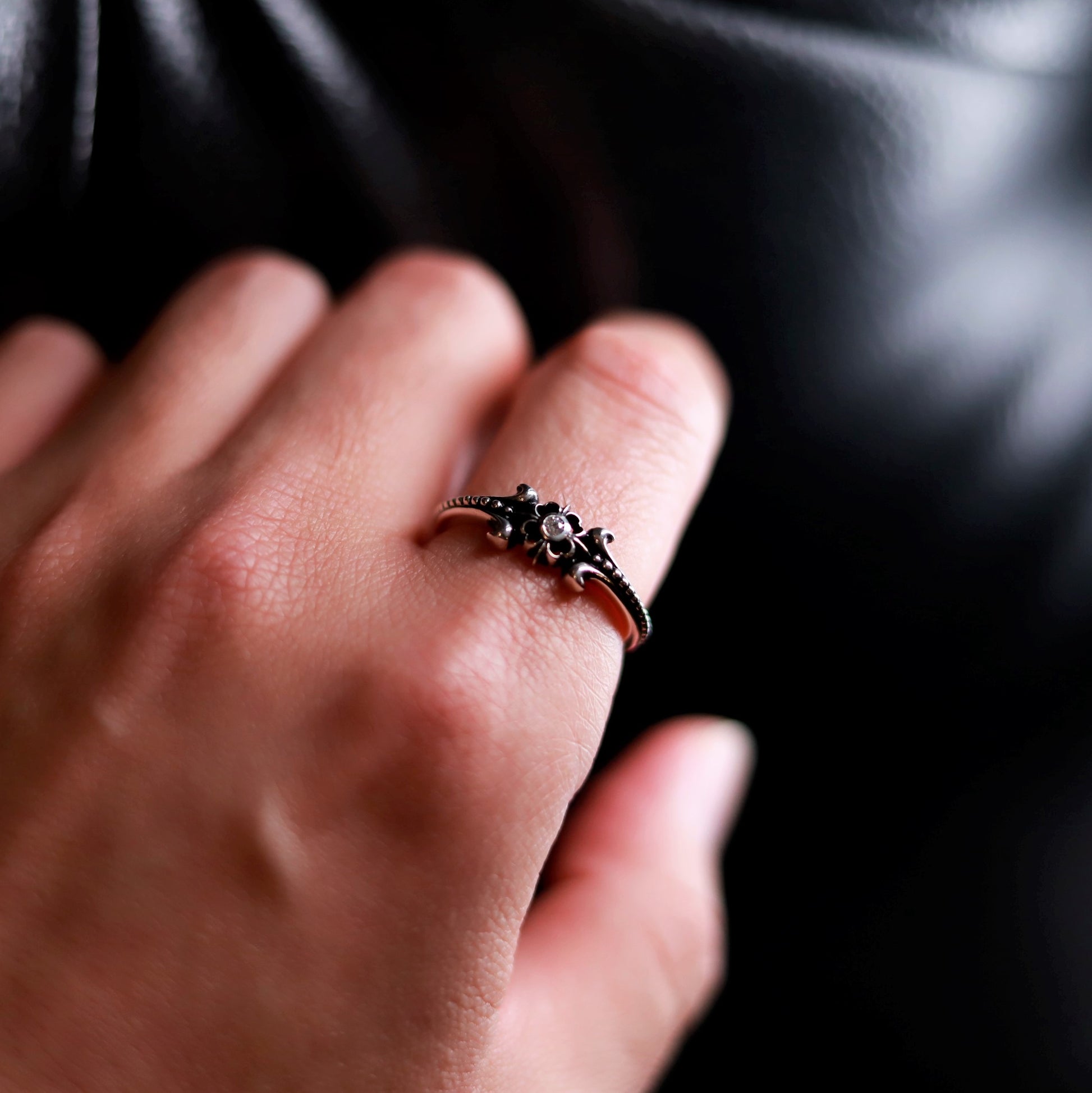 リング自体は細いですが、繊細なデザインにしっかりと濃い燻しが入っています。