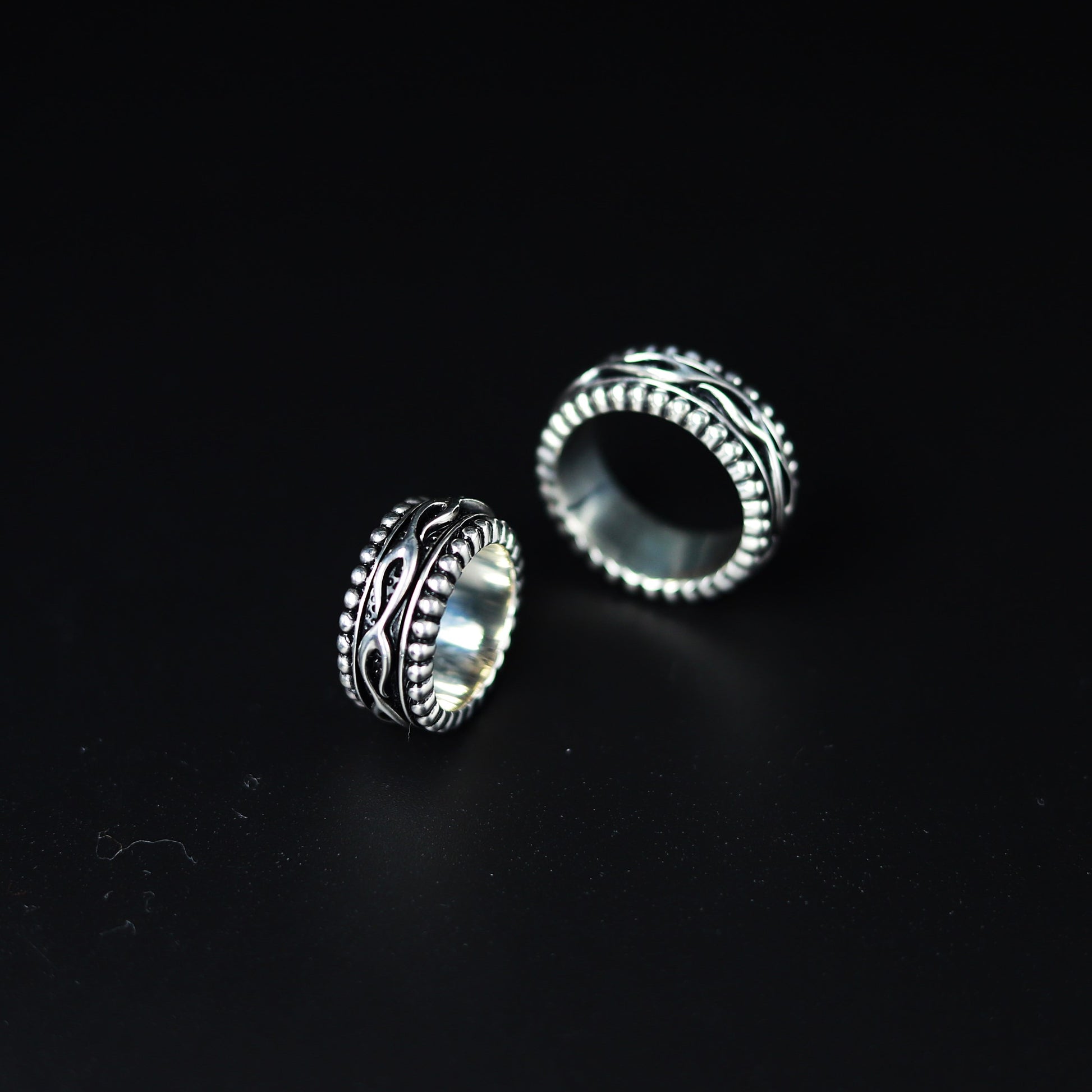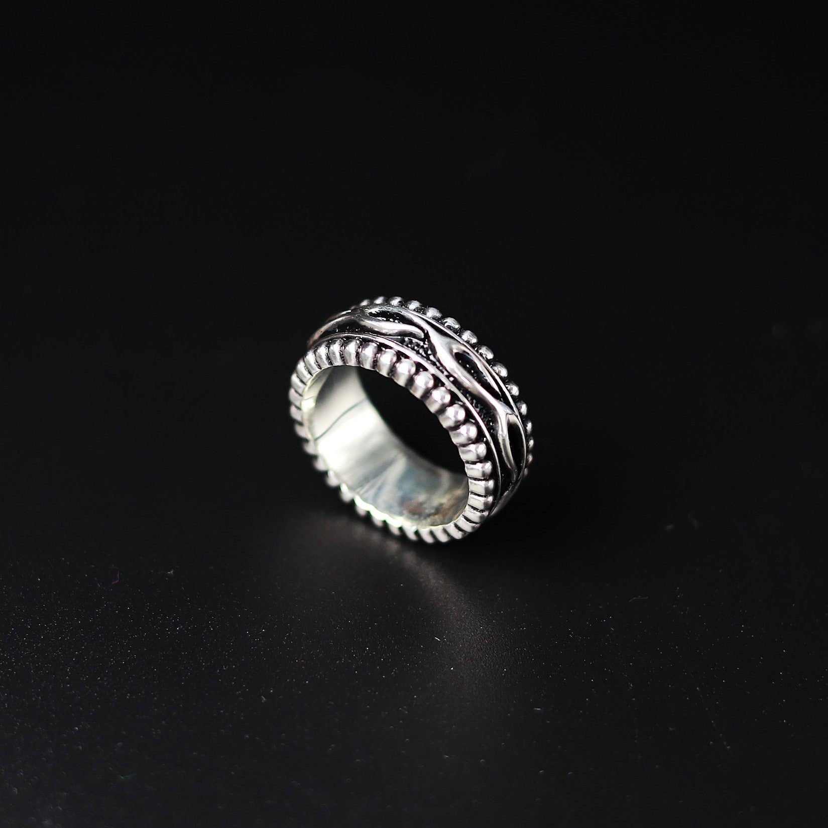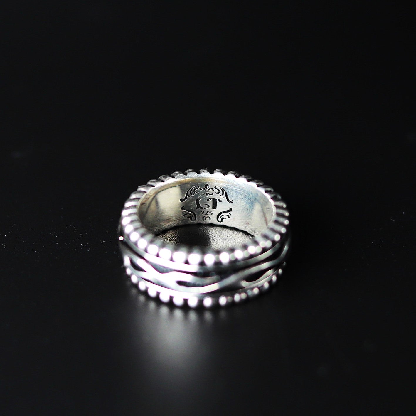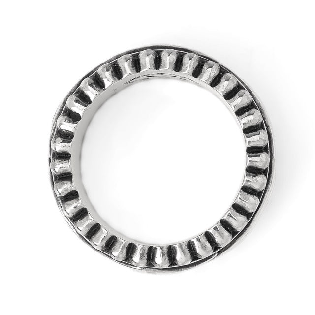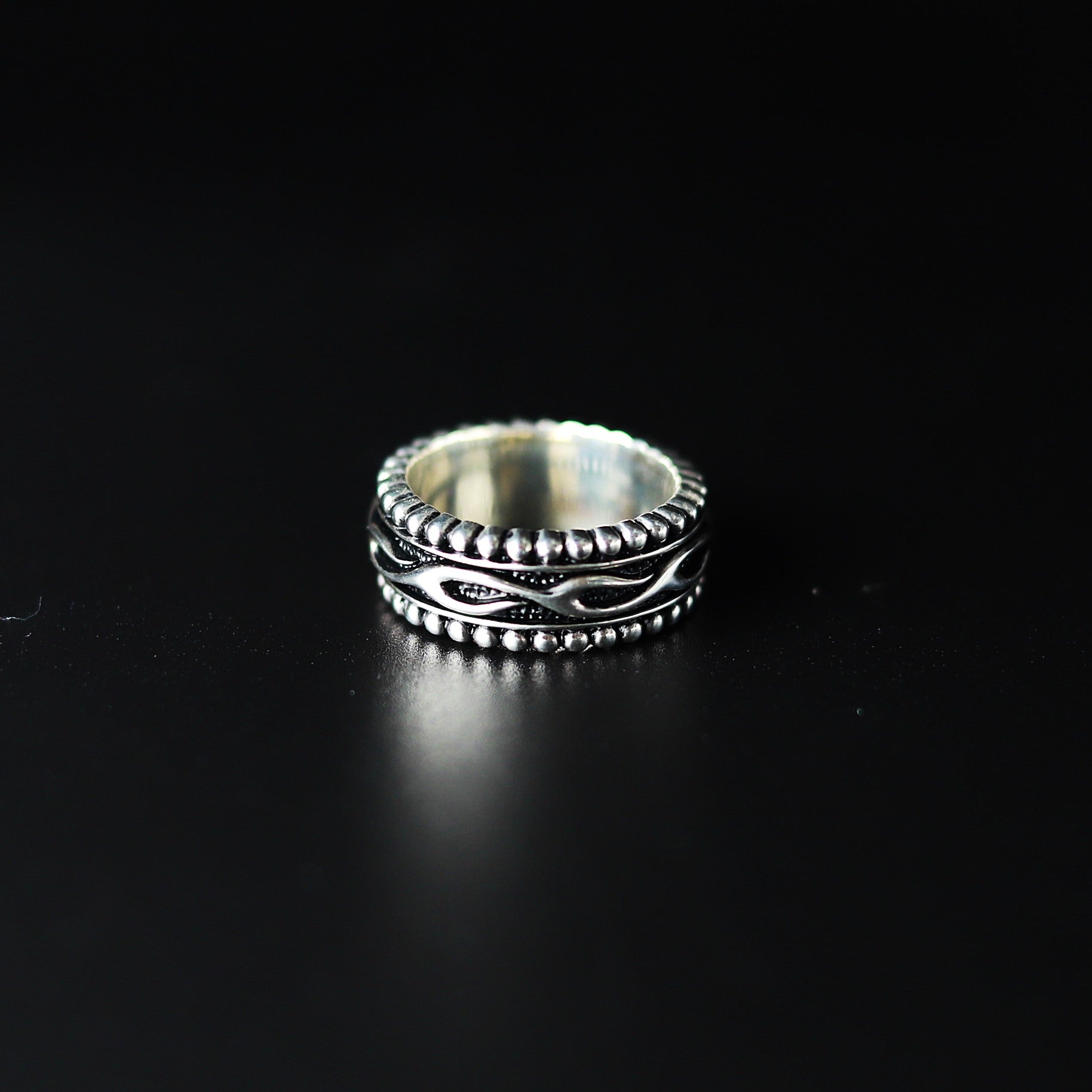 ■ リングの上下にビーズ型の彫刻を施した、中央が回転するリボルビング技法で作られたリング。