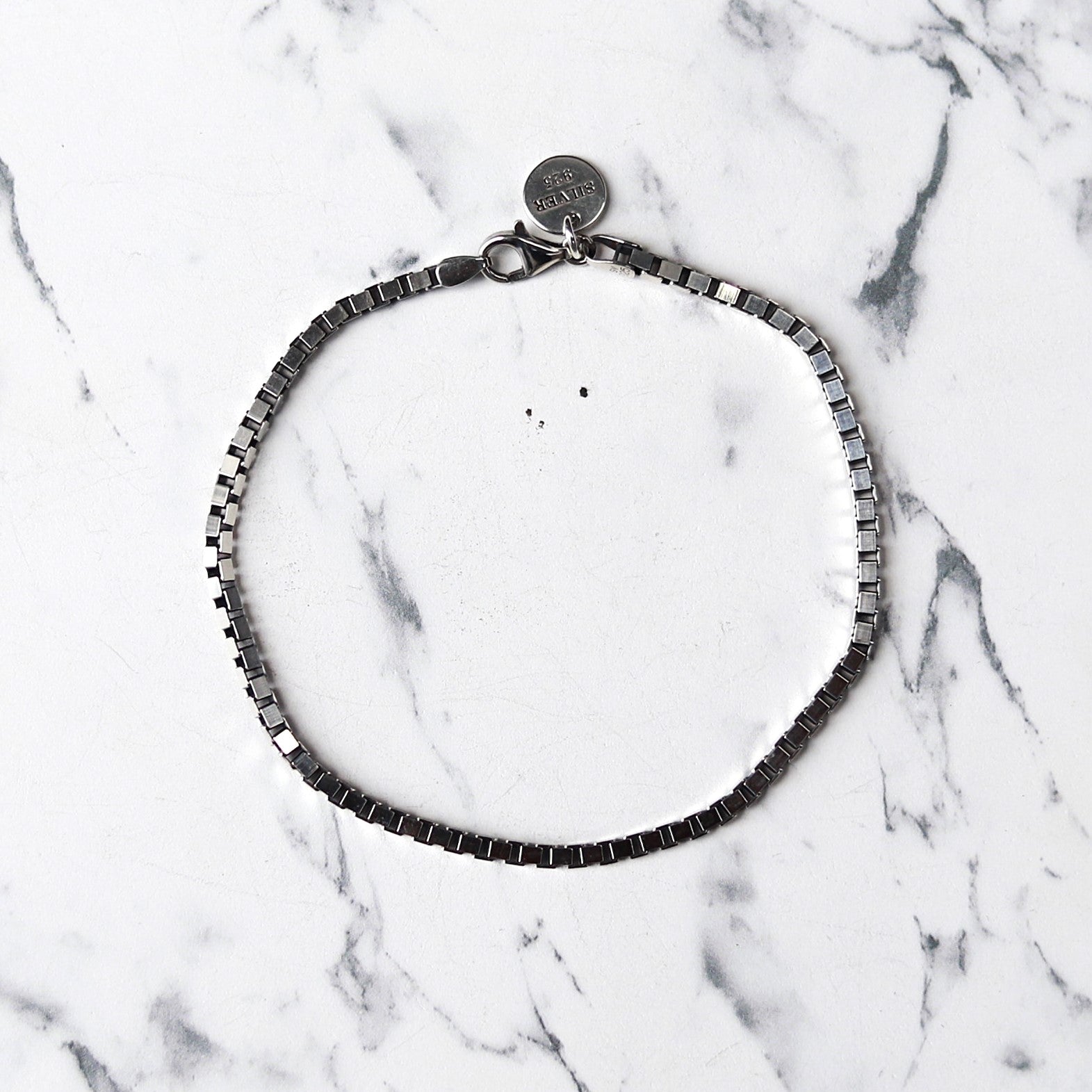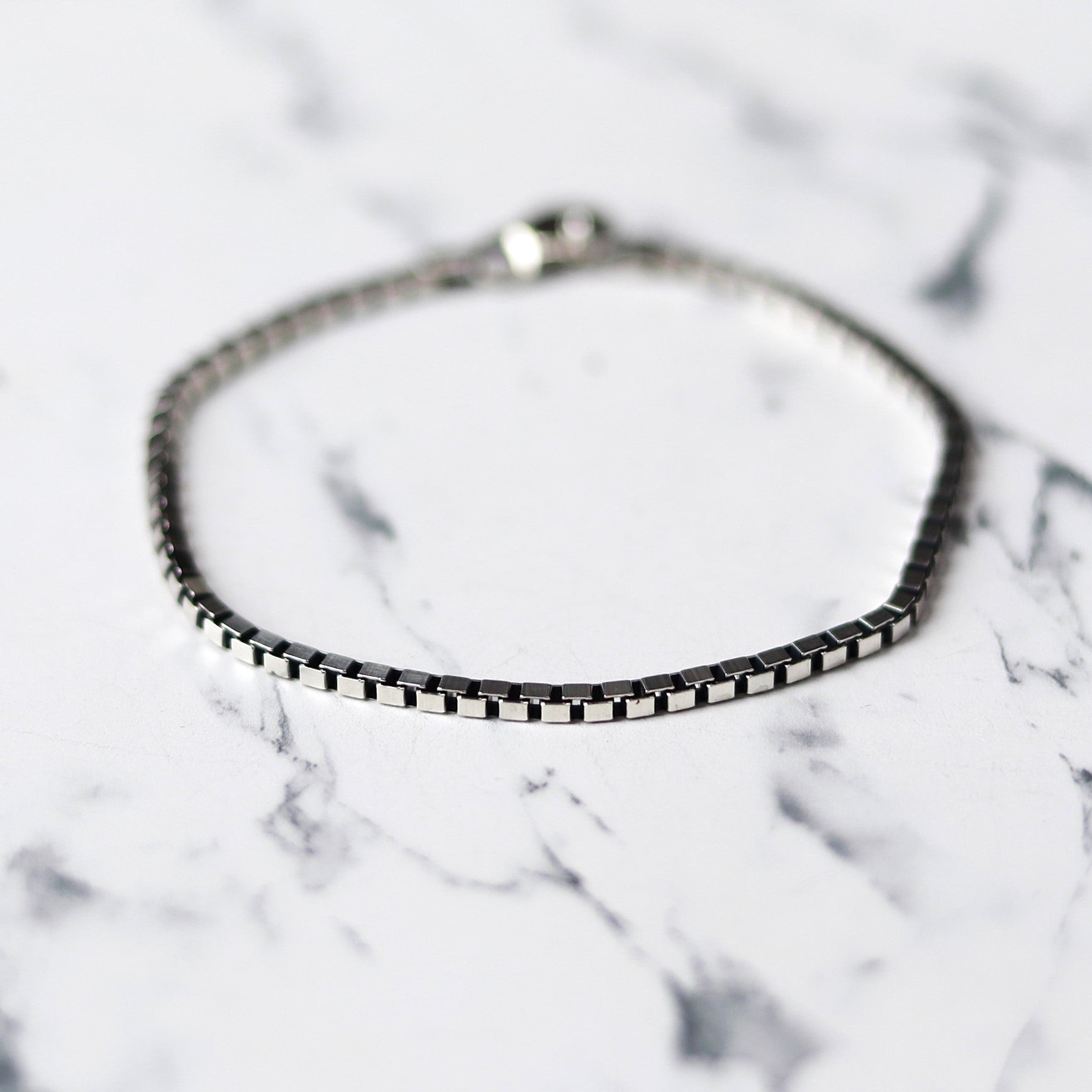 ■ 幅約3mmのBOXチェーンは別名ベネチアンチェーンとも呼ばれ、BOX型の金具が連なり直線的なシルエットがスタイリッシュなデザインです。