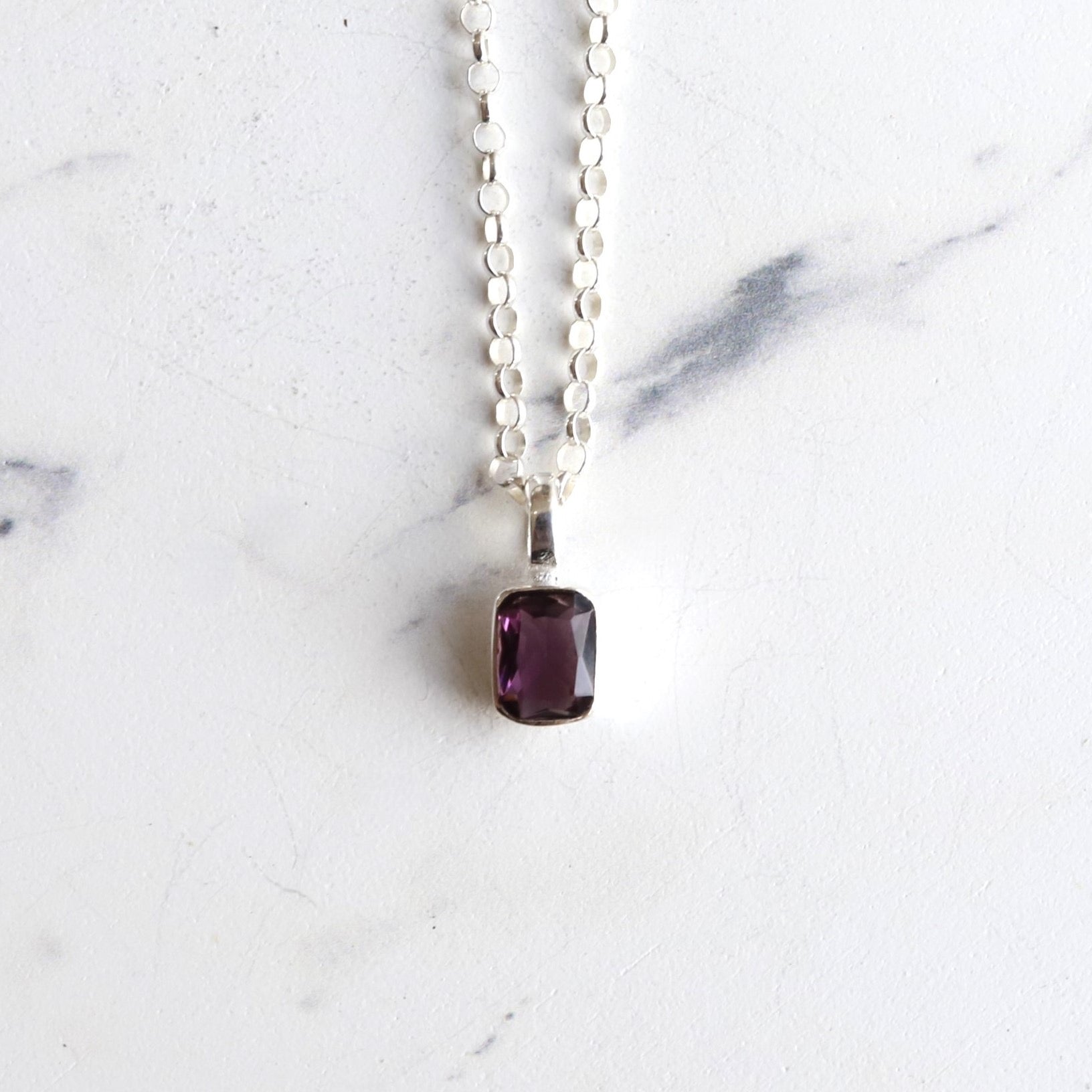 ■ 小さめなスクエアの色石がかわいいネックレス。薄紫色のアメジストは重たくならないライラックパープルが個性を彩ります。