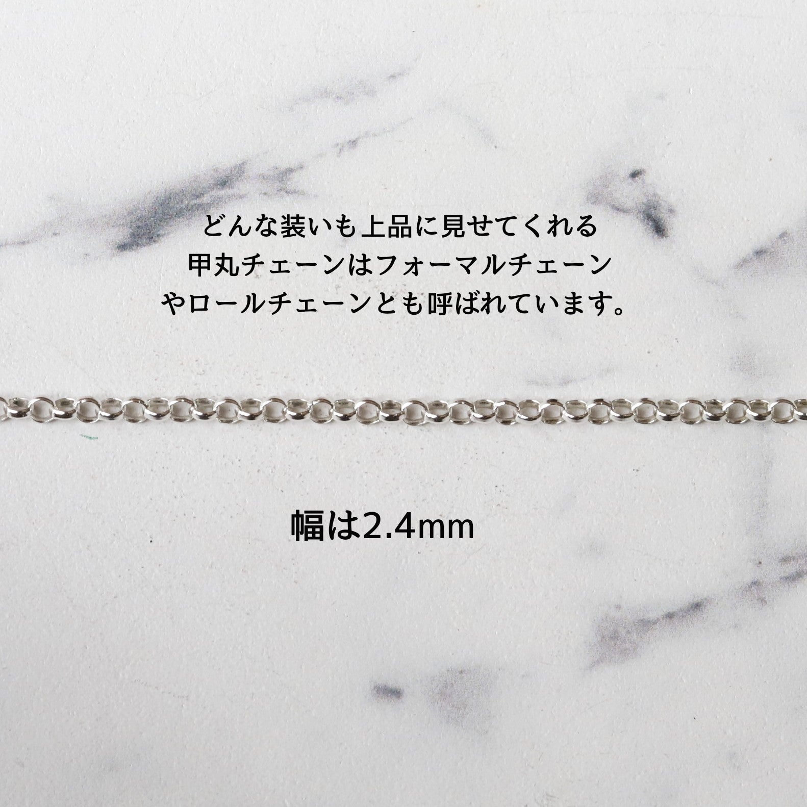 ■ 細めで極めてシンプルな甲丸チェーンですがシルバー独特な輝きがどんな装いも上品に見せてくれます。甲丸チェーンはフォーマルチェーンやロールチェーンとも呼ばれています。