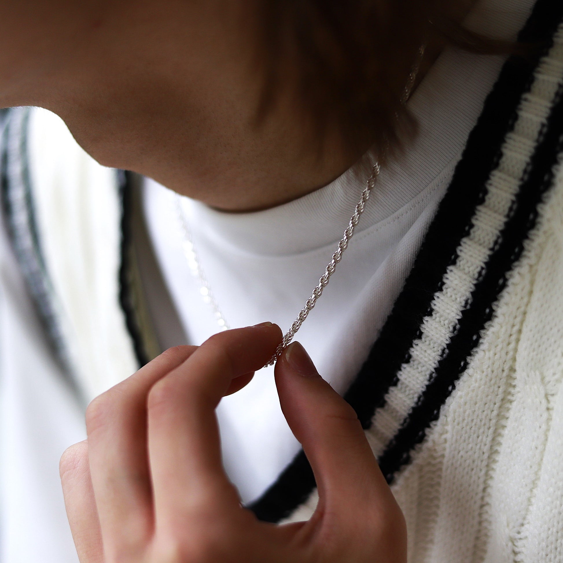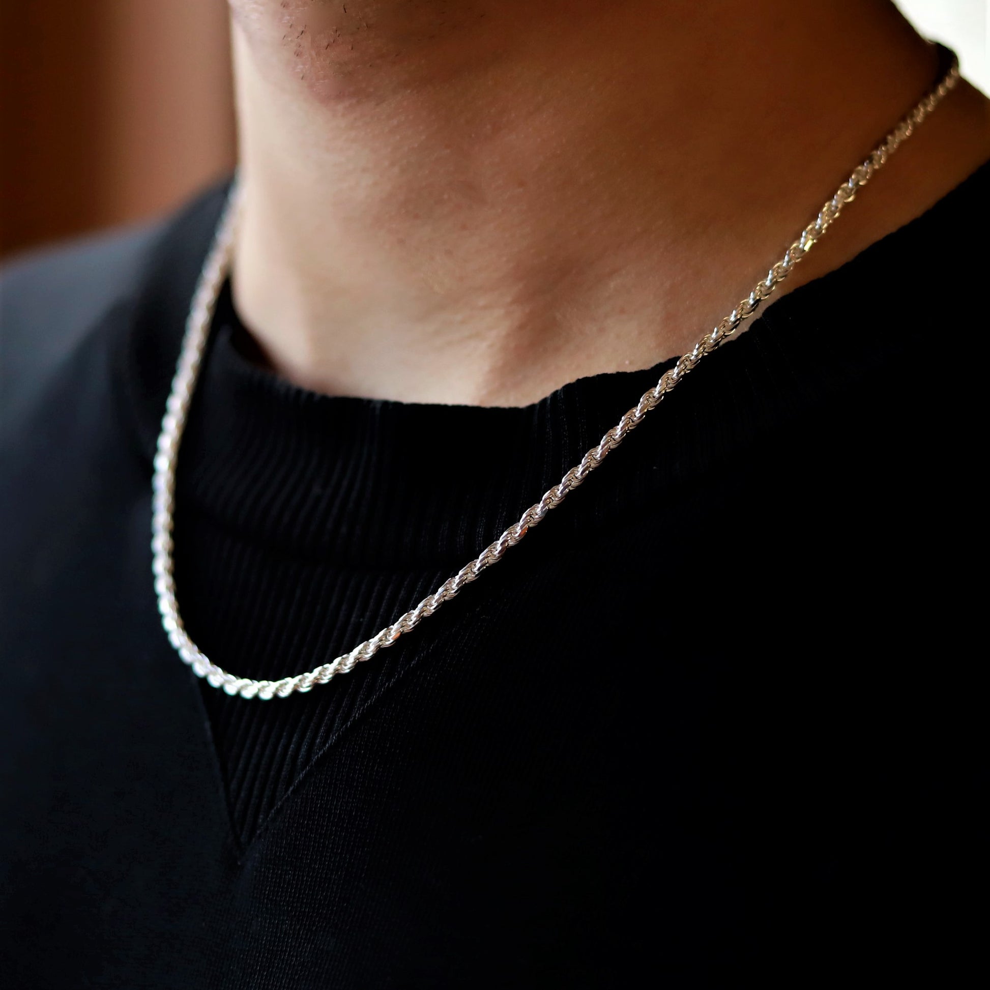 しめ縄が編み込まれたように作られたチェーン。輪っか (丸カン) を三重に繋ぎ合わせ、ロープのように編み組まれたチェーンをロープチェーンと呼びます。